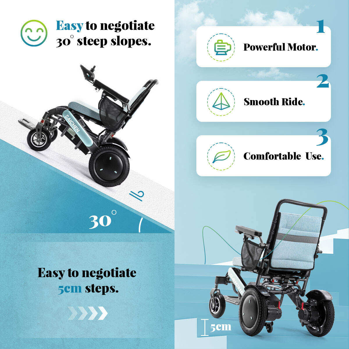 With its remarkable long-lasting energy life, the recently improved lightweight lithium battery allows users to be mobile and independent for longer periods of time. Furthermore, customers can conveniently reassemble the battery for on-the-go recharging, as it can be rapidly dismantled. The wheelchair is more convenient to use because to this useful feature.